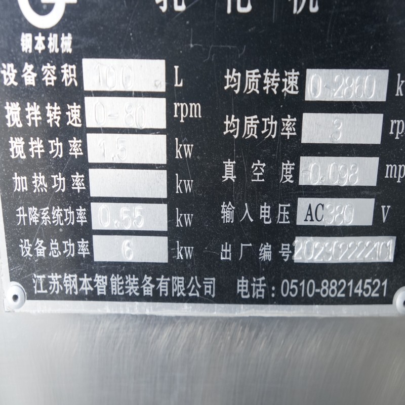 เครื่องผสมอิมัลซิไฟเออร์ 100 L เป็นอุปกรณ์ ที่ออกแบบมาสำหรับอิมัลซิไฟเออร์ และผสมสารต่าง ๆ ในสภาพแวดล้อมสูญญากาศ อุปกรณ์นี้ มีถังผสม ที่มีความจุ 100 ลิตร และนำไปใช้อย่างแพร่หลายในอุตสาหกรรมรวมถึงอาหารยาเครื่องสำอาง และยาฆ่าแมลง